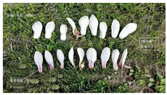 ▲白玉蘭:9瓣花瓣,花萼不分化,花被片純白為栽種型,基部稍粉為野生型。(圖片來(lái)源:網(wǎng)絡(luò ))