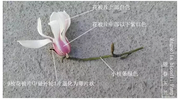 ▲望春玉蘭:花被片中部以下紫紅色,上部白色。9枚花被片中最外輪3片退化為萼片狀。(圖片來(lái)源:網(wǎng)絡(luò ))