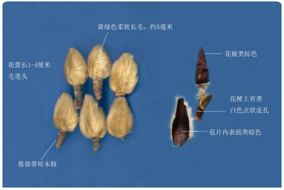 ▲望春花的干燥花蕾,呈倒圓錐狀,形如毛筆頭,黃綠色柔軟長(cháng)毛,基部帶有木質(zhì)短枝。(圖片來(lái)源于網(wǎng)絡(luò ))
