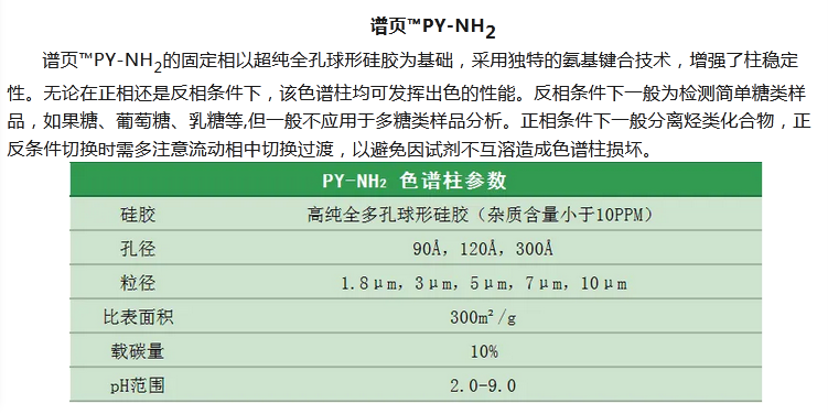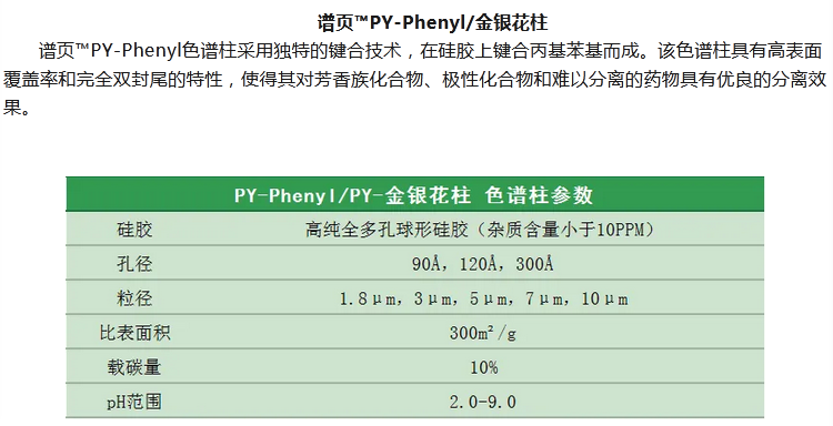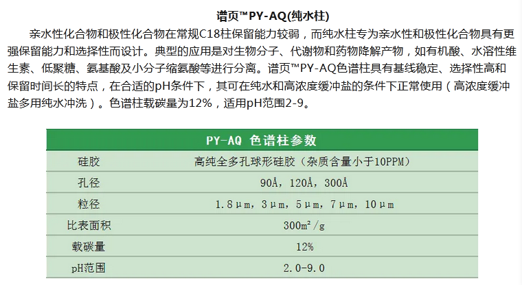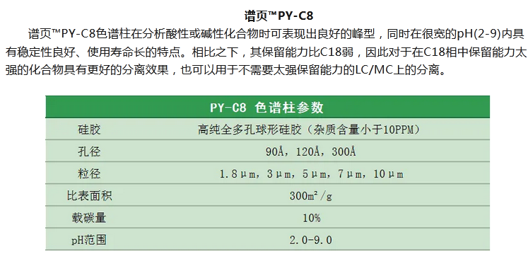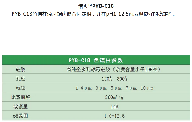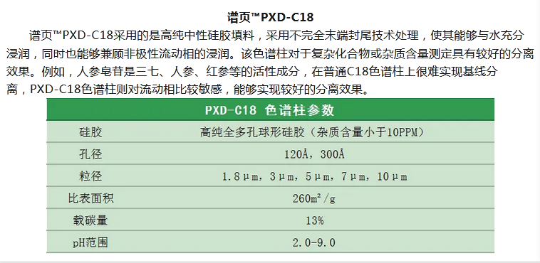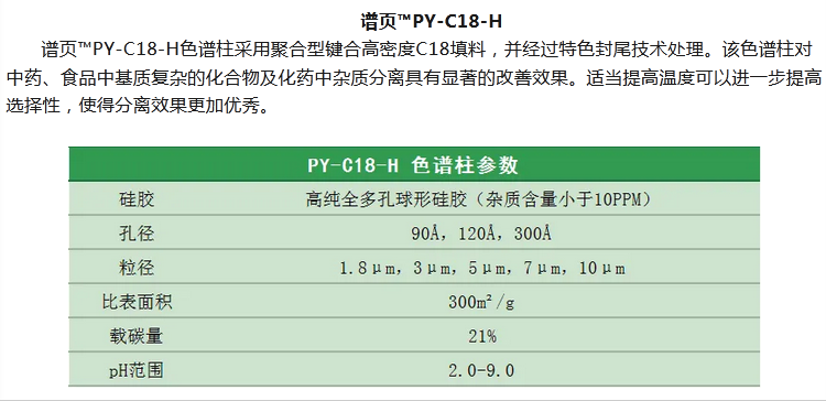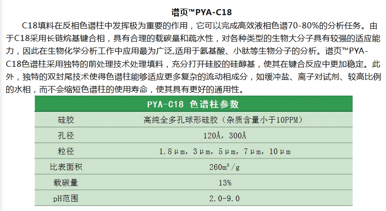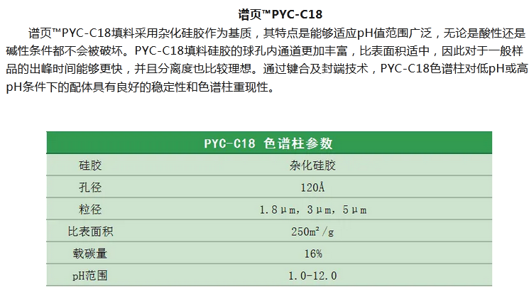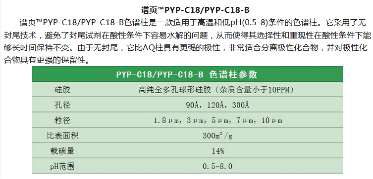 譜頁(yè)?PY-C18是本系列C18柱中最具普適性的色譜柱,具有優(yōu)異的穩定性、獨特的官能團鍵合及均勻的小分子封尾技術(shù)涂層,確保固定相具有高選擇性。加上獨有的裝柱工藝,使其擁有穩定的基床,從而具有更高的柱效及批次間穩定性。適合分離酸性、中性和堿性化合物以及小分子多肽等。