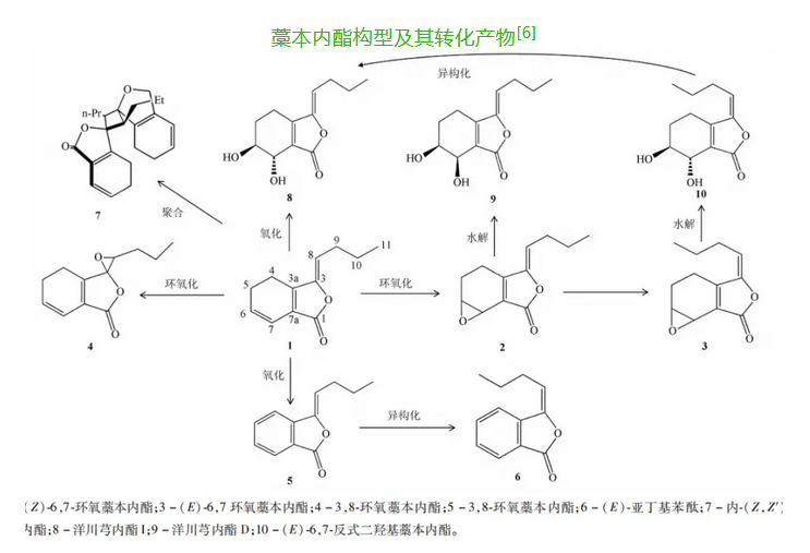 藁本內酯結構中有環(huán)外雙鍵可分為順?lè )磧煞N異構體即(Z)-Ligustilide和(E)-Ligustilide。由于Z型結構為空間優(yōu)勢構象比E型更穩定,因而Z型藁本內酯在中藥材中含量為E型的10倍以上[1]。藁本內酯是不飽和苯酞結構且3位上有活潑的丁烯基,因而穩定性不佳極易發(fā)生異構化、氧化、環(huán)加成、聚合等結構變化產(chǎn)生其他結構相近的苯酞類(lèi)化合物。