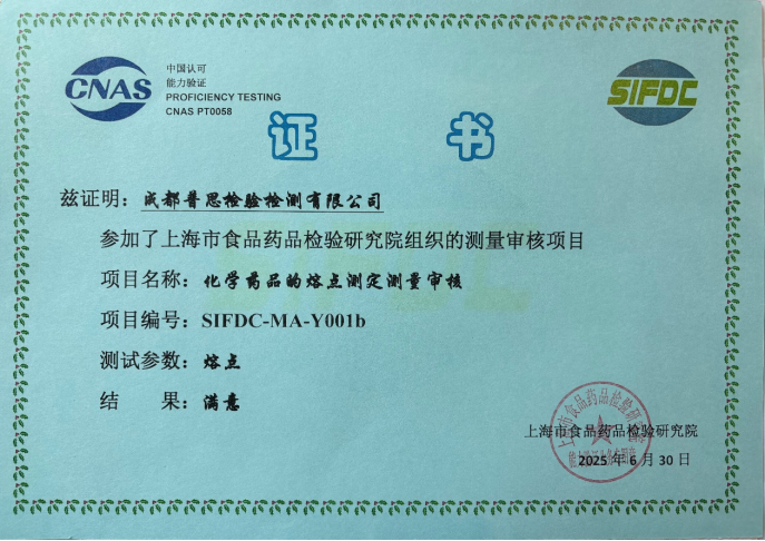 近日,成都普思生物科技股份有限公司旗下子公司“成都普思檢驗檢測有限公司”通過(guò)了由上海市食品藥品檢驗研究院于2025年組織的測量審核項目“化學(xué)藥品的熔點(diǎn)測定”,結果為“滿(mǎn)意”。