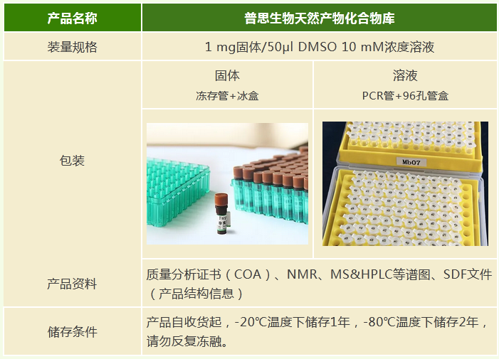 普思生物專(zhuān)注于天然產(chǎn)物研究與產(chǎn)業(yè)化應用二十載,擁有許多積累了豐富分離純化經(jīng)驗的技術(shù)人員,具備強大的創(chuàng )新研發(fā)生產(chǎn)力。公司聚焦于天然藥物研究開(kāi)發(fā)需求,旨在為中藥現代化研究及先導化合物的發(fā)現提供高質(zhì)量物質(zhì)基礎?,F結合化合物結構、來(lái)源、功能與應用方向等推薦以下精選天然產(chǎn)物化合物庫: