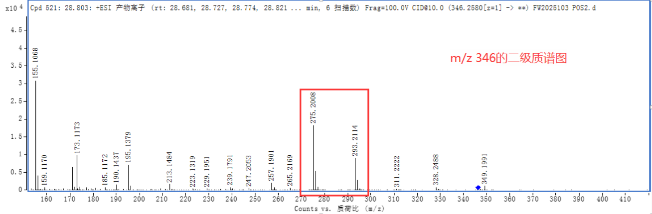 然分子量292的排除需結合二級質(zhì)譜圖,可發(fā)現275、293均為分子量328的[M+NH4]+的碎片離子。