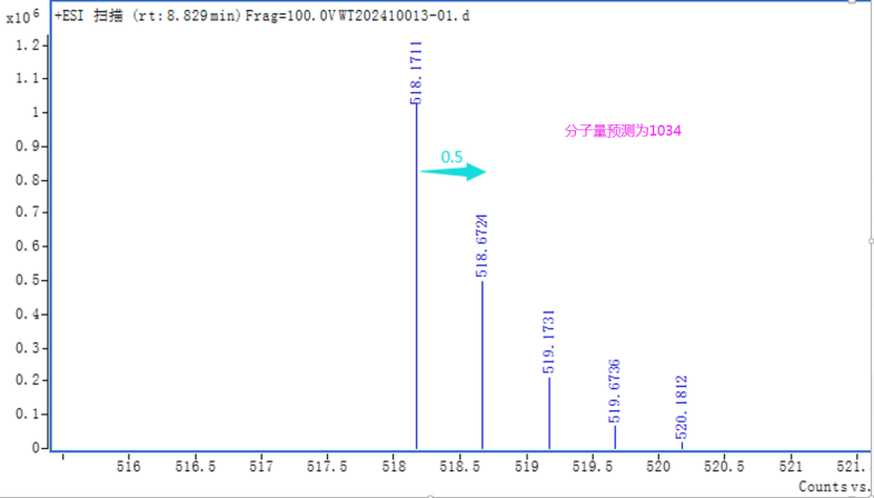 特別要注意的是,同位素間隔除了與元素種類(lèi)相關(guān),也與電荷態(tài)相關(guān),也是容易出現預測失誤的關(guān)鍵點(diǎn)。通常情況下,同位素間隔=1/電荷態(tài)。如同位素間隔為0.5,則為雙電荷,分子量往往為分子離子的2倍。