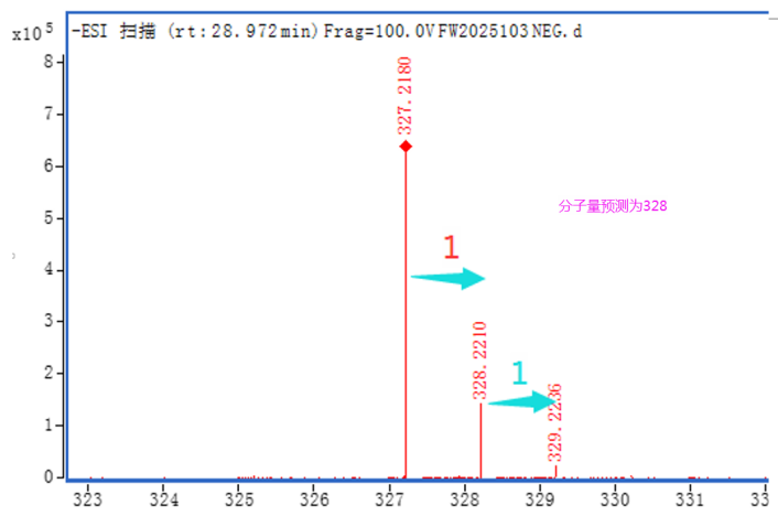 分子量預測過(guò)程中,最容易導致誤判的是圖中出現的看似“相關(guān)”的干擾離子,如[M+NH4]+與[M]+,[M-H2O+H]+與[M +H]+都是間隔18。如下圖中,275與293,328與346均間隔18,單正模式,無(wú)法確定分子量為292還是328。但結合負模式可確定為328。