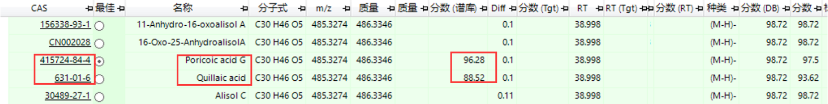 對于軟件擬合的分子式,可通過(guò)“N規則”、天然產(chǎn)物常見(jiàn)元素、擬合的質(zhì)量偏差、擬合分數等進(jìn)行進(jìn)一步縮小范圍,獲得最可能的分子式結果,以獲得更準確結果。