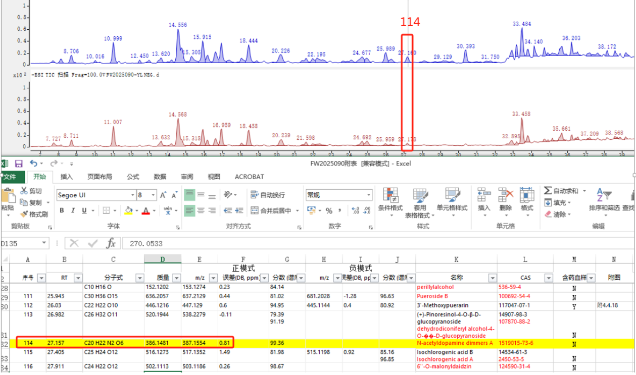 當然,要保證結果的準確性,單依賴(lài)數據庫是遠遠不夠的。人工審核有助于排除假陽(yáng)性和假陰性結果。如下圖114號峰,數據庫判定為分子量386的化合物,但通過(guò)回歸質(zhì)譜峰發(fā)現,該峰有兩個(gè)明顯分子離子峰387和563。那么563就是一個(gè)假陰性結果,387如果是563的碎片就是一個(gè)假陽(yáng)性結果,需要進(jìn)一步通過(guò)二級碎片去驗證。